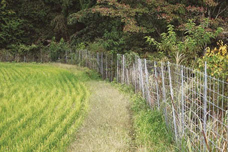 約20年前より野生動物による農作物被害が深刻化し、集落で対策を実施。「安全な囲いの中に人間が住むイメージ」と日田鳥獣対策委員会の小谷知載さんが話すように、集落を柵で囲み、柵の外側には掘りを作った。随所に設置する罠を見回り、野生動物がかかっていると仕留めて解体処理施設へ搬入。年に数回、村で収穫祭を開き、命に感謝を捧げる。