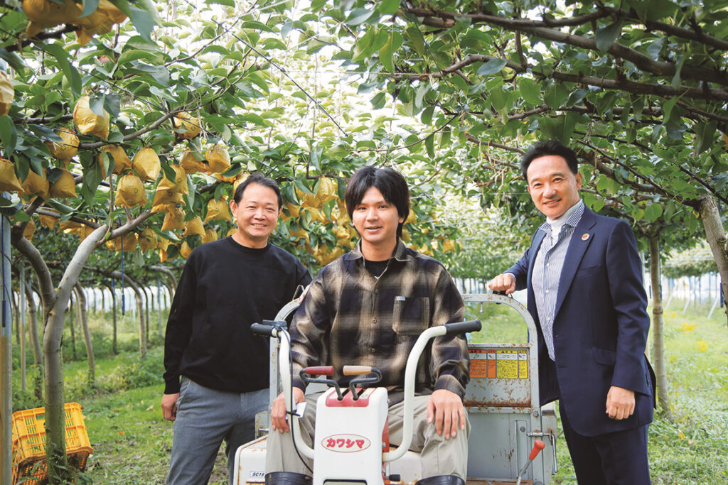 JAの職員を経て就農した20代の農家、丸山翔吾さんによる農園。「新甘泉」「王秋」といったナシを中心に、慣行栽培よりも農薬や除草剤を減らし、環境に優しい栽培に挑戦。効率化や栽培にこだわりながら、儲かる農業を目指す。