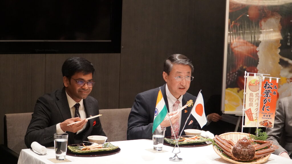当日は、建国77周年を迎えたインドのチャンドル・アッパル在大阪・神戸総領事を招待し、鳥取県が誇る冬の味覚・松葉がにを中心に、食の魅力と国際的な可能性を発信した。