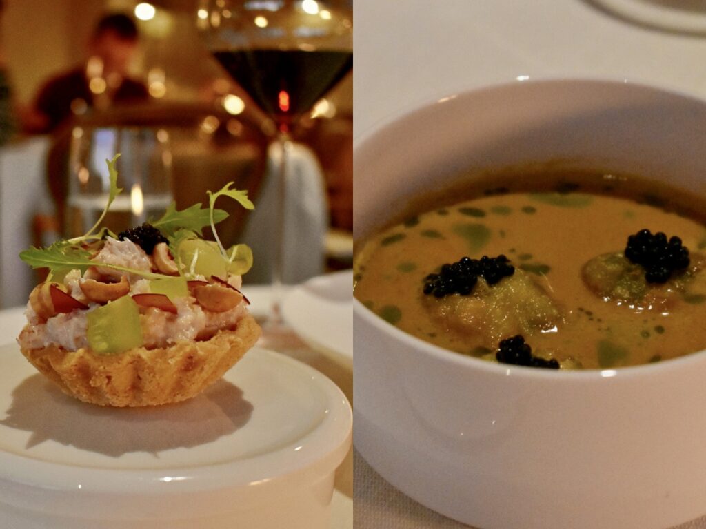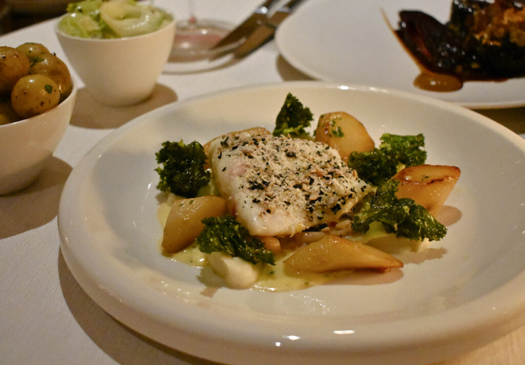 この手のレストランとしては珍しく、ウッドコートはテイスティング・メニューではなくアラカルトで勝負している。筆者が訪れた際にはカニ料理の前菜が大人気で、次々と各テーブルへと運ばれ賞賛を浴びていた。新鮮なカニ肉を詰めて甘酢キュウリやキャビアなどでアクセントを添えた爽やかなタルトレットの皿の下には、3つのチーズ・ベニエが見え隠れする濃厚なロブスター・ビスクのボウルが重ねられ、2通りの調理法でふんだんにカニを楽しむ趣向だ。