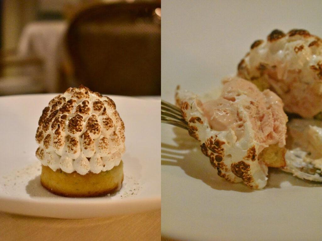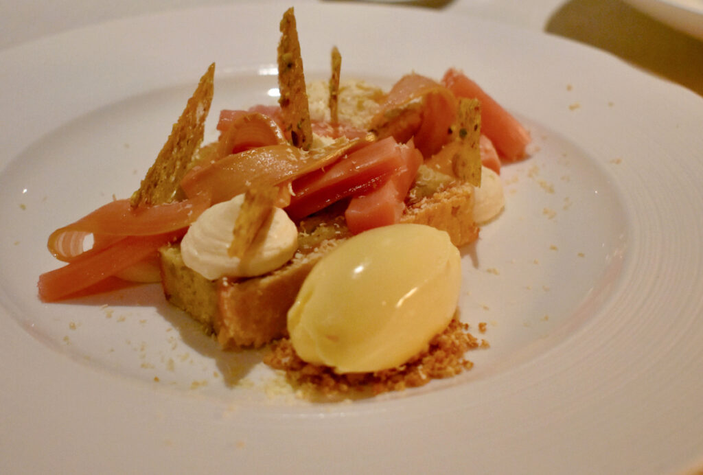 デザートでなど使うフルーツの大半も敷地内の木々から採れたもの。養蜂も行っているのでハチミツも自家製だ。この日いただいたルバーブ・ポーチを添えたピスタチオ・ケーキは最高だった。濃厚なバターとピスタチオのスポンジにピンク色が映え、ルバーブのムースとカスタード・アイスクリームがえも言われぬ春のハーモニーを奏でていた。